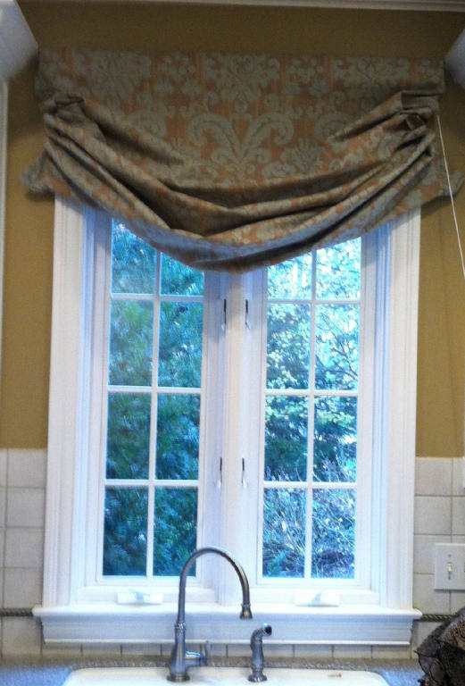 The same client wanted a matching relaxed Roman shade for her kitchen sink window. This narrow custom cover measure 48" x 58" and is lined with white fabric to match the exterior window trim. |  |