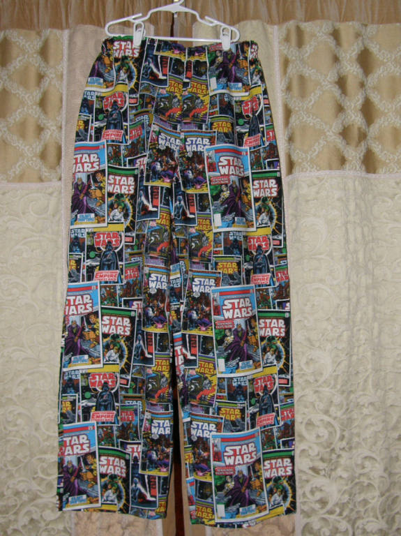 A grandmother wanted her grandsons to have Star Wars pj pants for Christmas. I had a size 8 for the youngest grandson and planned on buying more for her teen grandson. When she went to purchase the fabric, though, it was gone. I did find another Star Wars print that had a comic strip print. With grandma's approval, I will be making a teen size for her teen Jedi! |  |