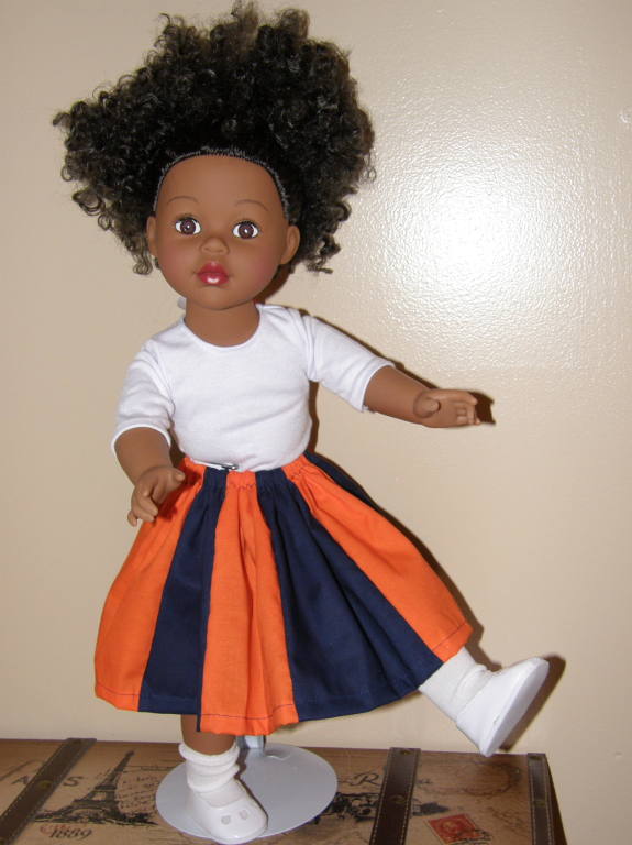 A mother contacted Sunnybrook Studio after seeing the Buckeye skirt for the 18" doll and asked if a skirt could be made in Denver Bronco colors. This Christmas gift was delivered before Thanksgiving! |  |