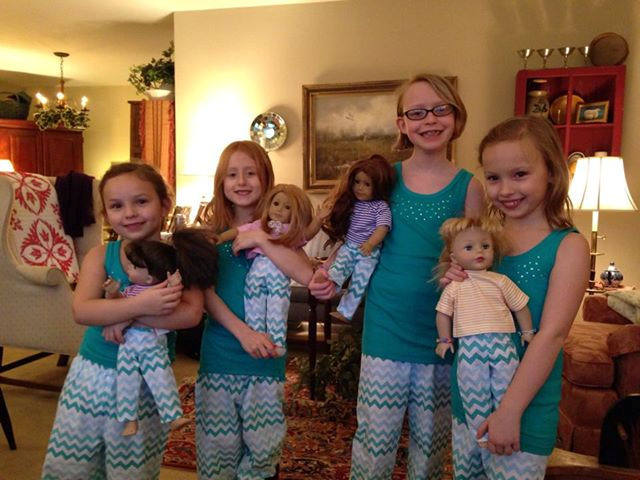 A mom contacted me to make matching pajama bottoms for her daughter and nieces and their 18" dolls. What a cute octet! |  |