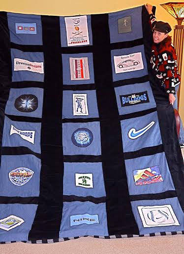 A mother contacted me to turn her son's high school and college T-shirts into a memory quilt. We met to discuss the layout and to pick the materials to finish the project. Her son was thrilled and touched by this unique keepsake from his youth. |  |