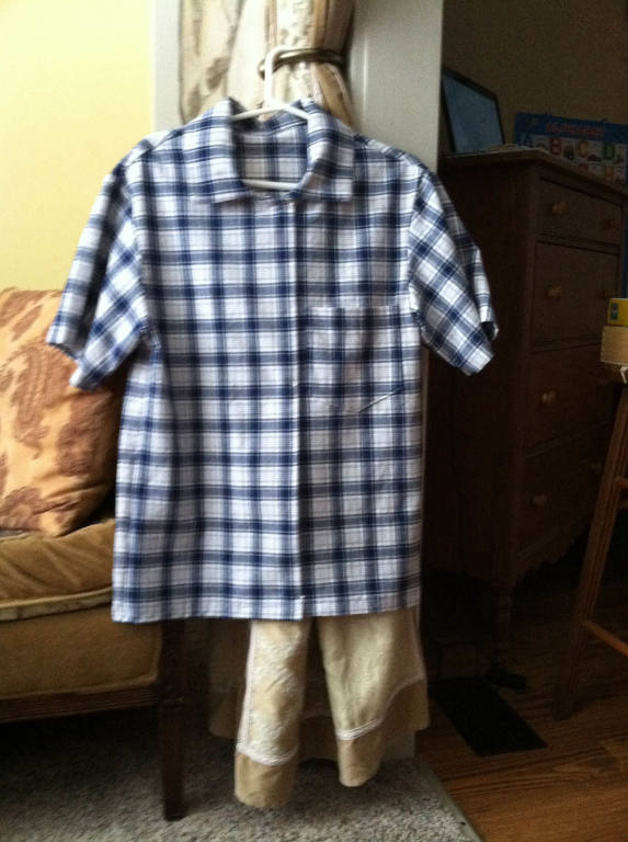 A grandmother was in search of a simple plaid button down shirt for her grandson. After search all the local department store she contacted me for help. She picked out plaid fabric in her grandson's favorite color and I made the shirt just in time for Christmas Day. |  |