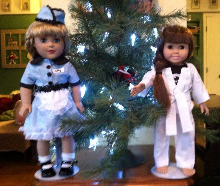 Parents contacted me to replicate their daughters' outfits for tap dance competition and tae kwon do. With a few photographs from the parents I created these 18' doll outfits for a very Merry Christmas for the Lawrence girls. |  |